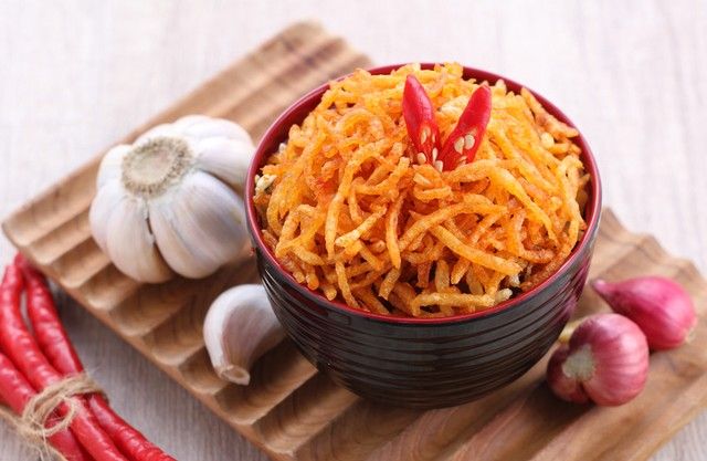 - Kecilkan api kompor, masukkan kentang goreng. Aduk cepat hingga tercampur rata. Angkat. Sajikan.