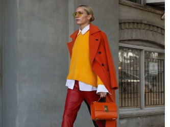 1. Jangan ragu tampil playful pakai kombinasi warna-warna nyentrik! Tumpuk fuchsia turtleneck dan orange coat. Nggak ketinggalan neon skirt dan pink waist bag yang manis.