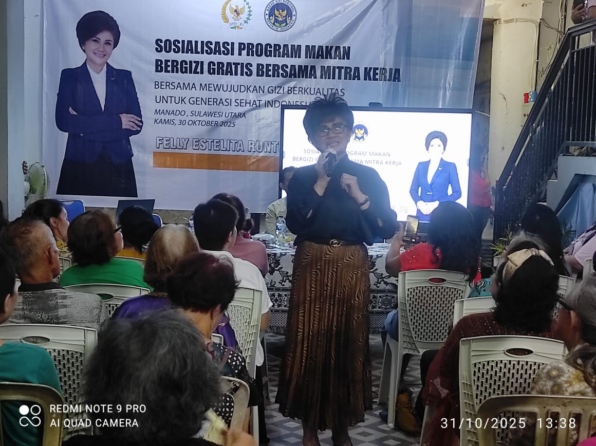 Manado, Sulawesi Utara (3/11) – Gizi menjadi prioritas terdepan dalam program Makan Bergizi Gratis (MBG). Meski begitu, MBG juga dirancang agar dapat meningkatkan perekonomian warga lokal dengan berperan aktif dalam menjalankan program strategis nasional ini. Hal itu disampaikan Ketua Komisi IX DPR RI, Felly Estelita Runtuwene, saat sosialisasikan program MBG di Karambosan Utara, Kecamatan Wanea, Kota Manado pada Jumat, (31/10).