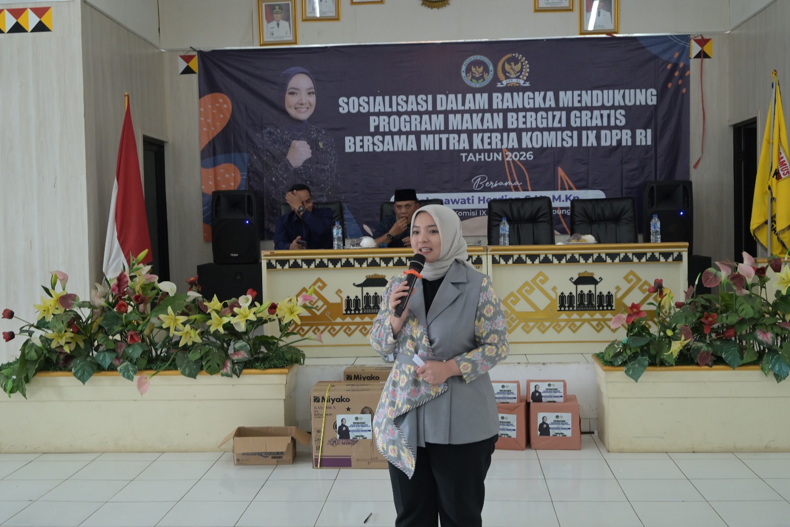 Tanggamus, Lampung (15/2) - Anggota Komisi IX DPR RI, Rahmawati Herdian, menjadi pembicara utama dalam kegiatan sosialisasi Program Makan Bergizi Gratis (MBG) bersama mitra Badan Gizi Nasional (BGN). Sosialisasi program MBG menjadi langkah pemerintah dalam memberikan edukasi ke masyarakat mengenai pentingnya menjalani pola makan hidup sehat sejak dini.