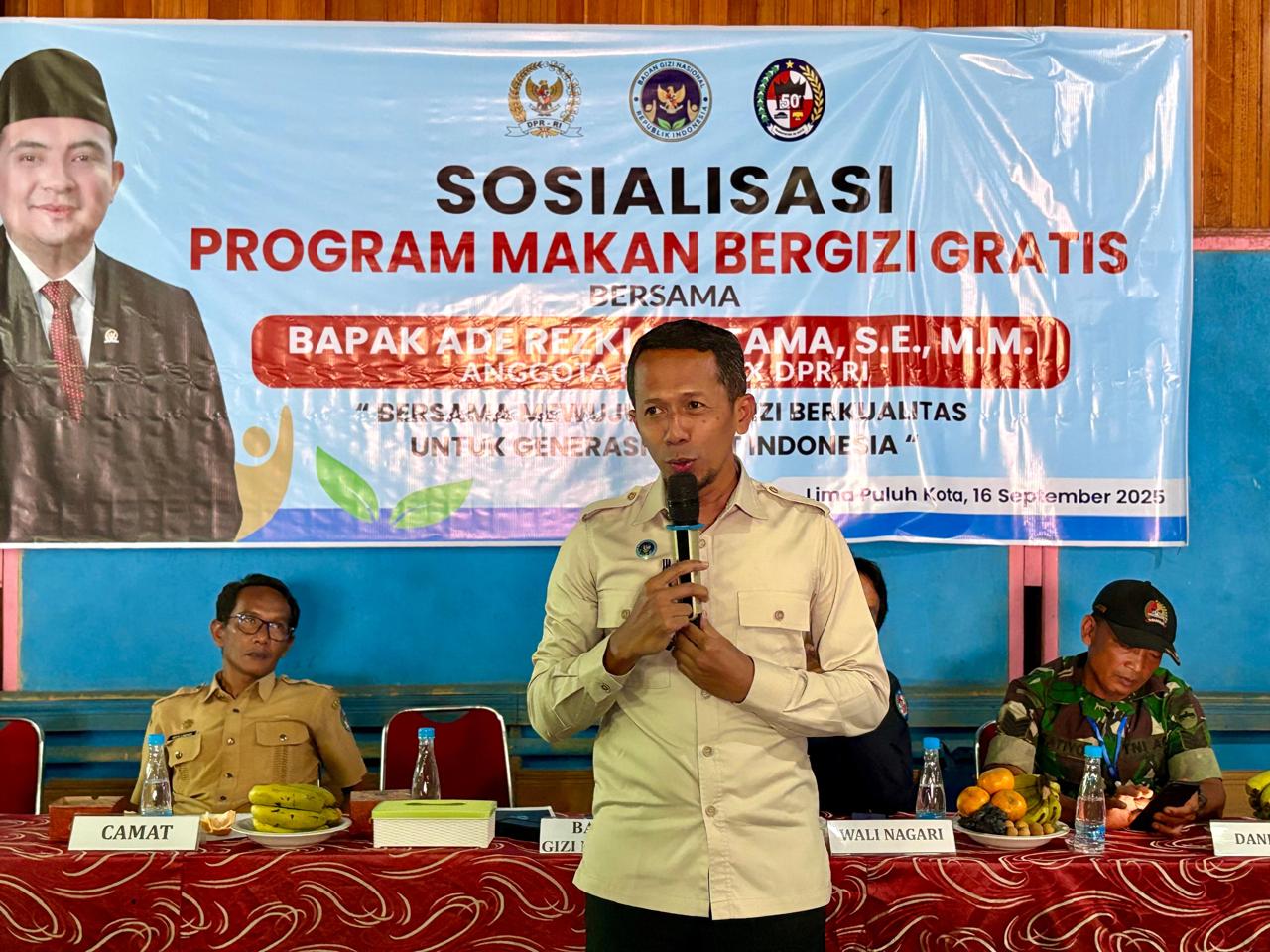 Dalam kegiatan sosialisasi yang digelar di Hall Badminton Jsa Kawan, Payakumbuh Lintau KM 08, Sumatera Barat, Ade Rezki Pratama hadir bersama perwakilan Badan Gizi Nasional (BGN) dan tokoh masyarakat. Ia menyampaikan bahwa MBG bukan hanya soal pemberian makanan gratis, tetapi investasi jangka panjang pemerintah bagi masa depan anak bangsa.
