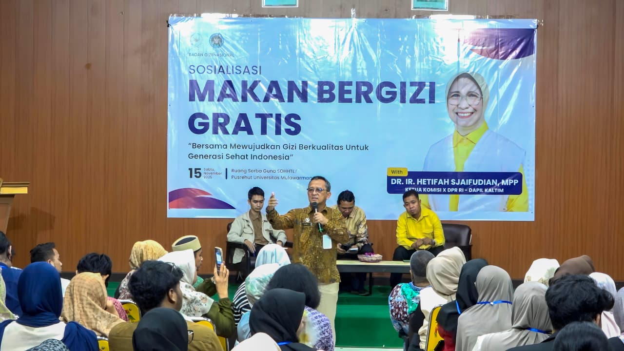 Samarinda, Kalimantan Timur (18/11) - Upaya pemerintah dalam meningkatkan kualitas gizi pelajar kembali diperkuat melalui kegiatan Sosialisasi Program Makan Bergizi Gratis (MBG) yang digelar di Ruang Serbaguna Pusrehut Universitas Mulawarman pada Sabtu (15/11). Kegiatan ini menghadirkan pemangku kepentingan dari tingkat legislatif, lembaga gizi nasional, hingga akademisi untuk memberikan gambaran menyeluruh mengenai arah dan implementasi program MBG di daerah.