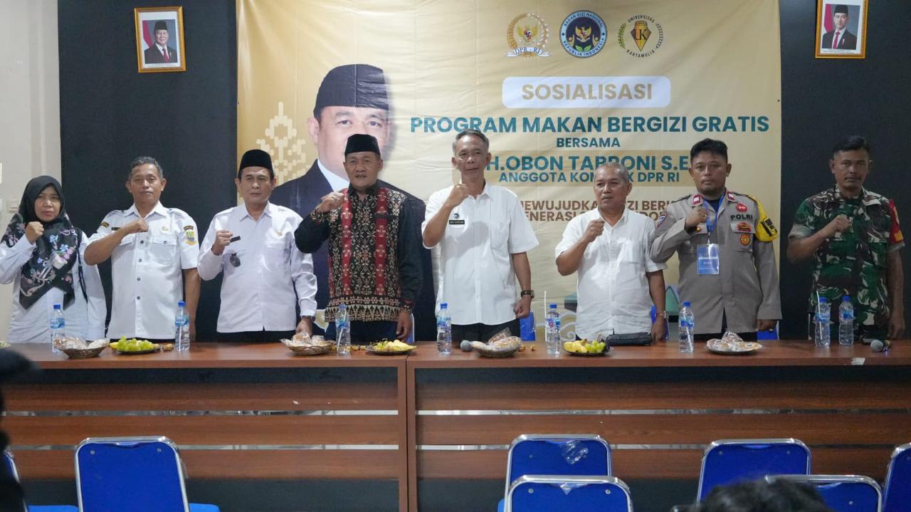 Acara sosialisasi MBG dihadiri oleh Anggota Komisi IX DPR RI Obon Tabroni, Kepala Desa Cikarageman Markun Hidayat, dan perwakilan Badan Gizi Nasional Dedi Suprijadi.