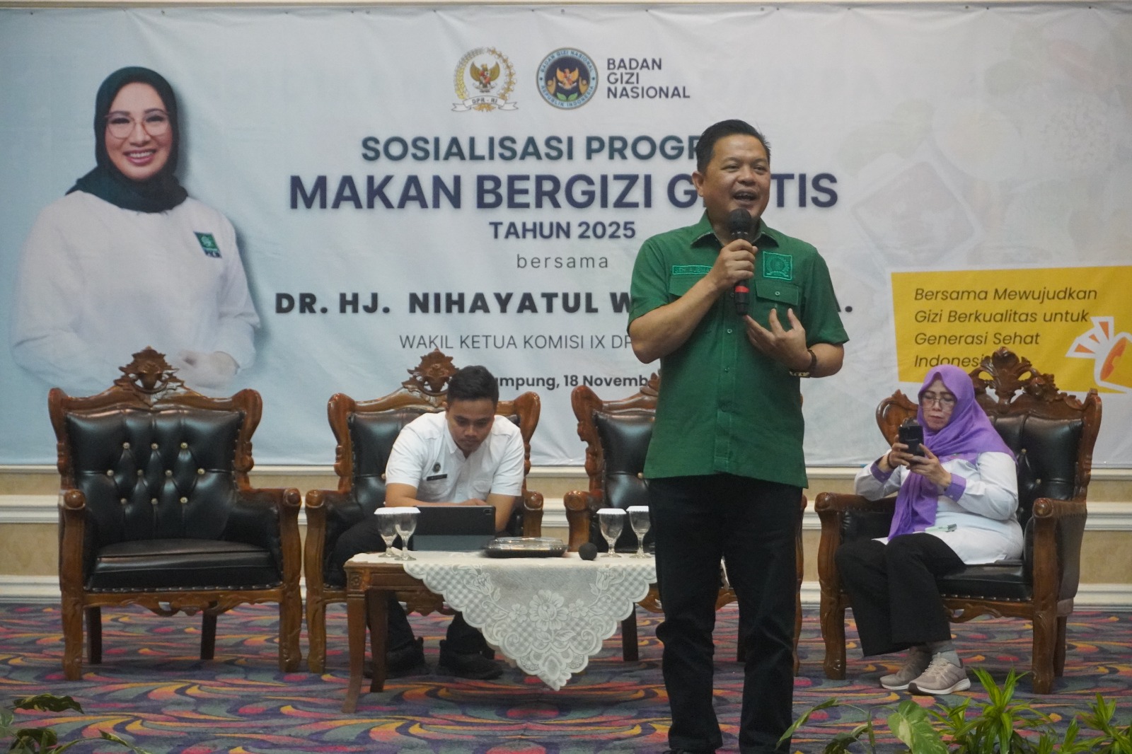 Bandar Lampung, Lampung (21/11) - Pemerintah bersama para pemangku kepentingan di Provinsi Lampung terus memperkuat langkah dalam mempersiapkan generasi Indonesia yang lebih sehat dan produktif melalui Program Makan Bergizi Gratis (MBG). Upaya tersebut diwujudkan dalam kegiatan sosialisasi yang digelar di Balai Keratun Pemerintah Provinsi Lampung, menghadirkan unsur pemerintah daerah, legislator, organisasi masyarakat, serta warga dari berbagai kecamatan.