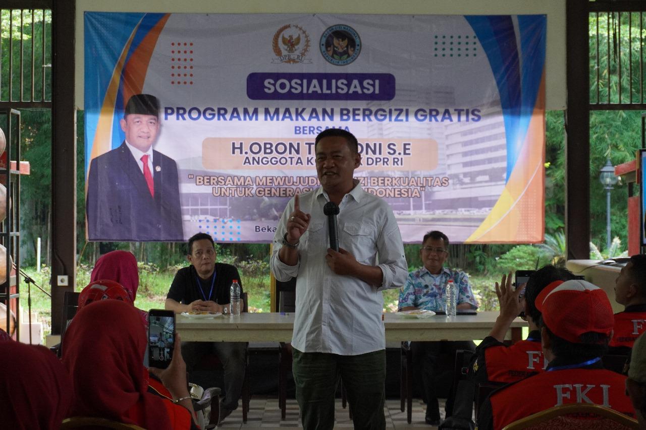 Cikarang, Jawa Barat – Anggota Komisi IX DPR RI Obon Tabroni sosialisasikan program Makan Bergizi Gratis (MBG) kepada warga Cikarang Minggu, 20 April 2025. Pemerintah menghadirkan program MBG untuk menjawab tantangan kekurangan asupan gizi dan tingginya kasus angka stunting di masyarakat.