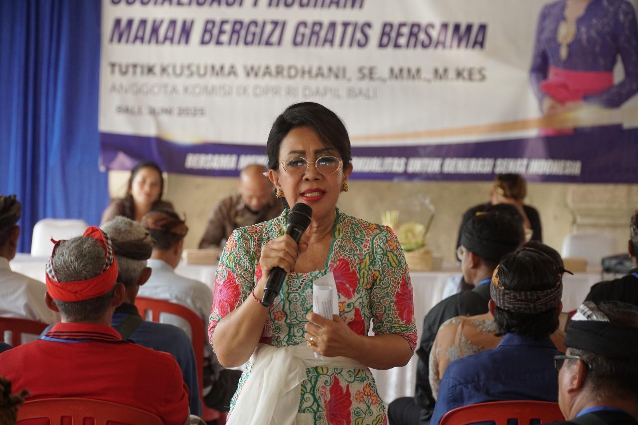 Hal itu disampaikan anggota Komisi IX DPR RI Tutik Kusuma Wardhani saat sosialisasikan program MBG di Desa Adat Denpasar pada Sabtu, 21 Juni 2025. Sosialisasi ini merupakan inisiasi DPR RI bersama mitra kerja Badan Gizi Nasional (BGN).